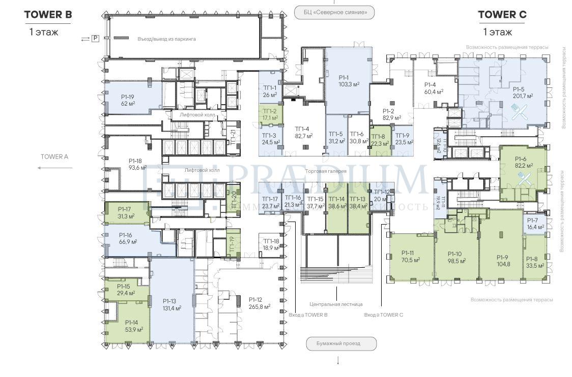 Описание: Башня "Tower В" и башня "Tower С" объединены общим стилобатом.