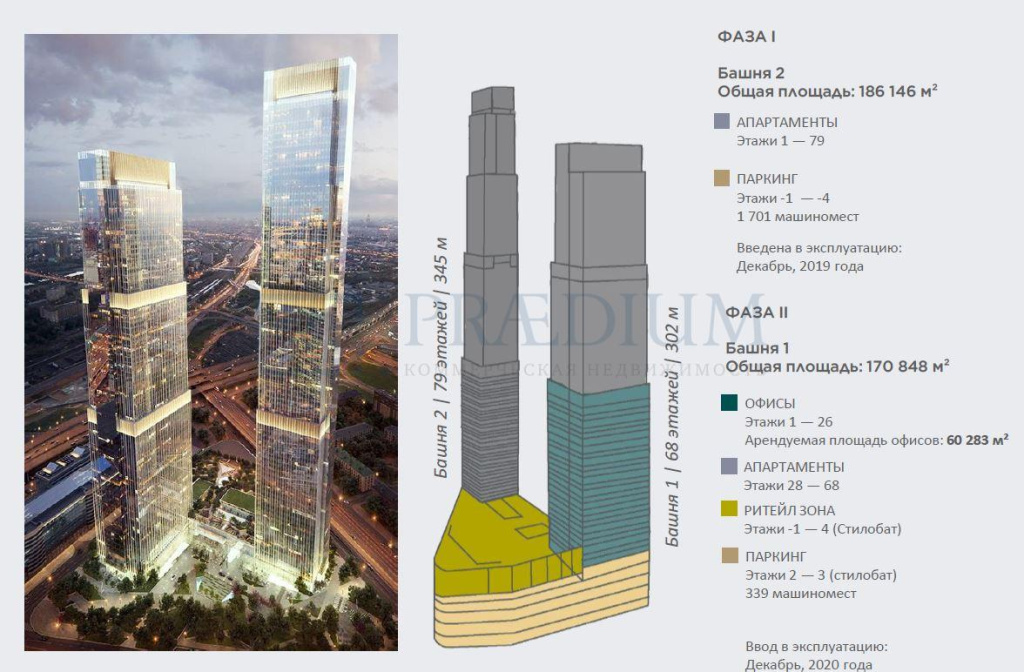 Башня 1-68 эт: 170 848 кв.м.; 1-4 эт-ритейл; 1-26 эт-офисы; 28-68 - апартаменты.