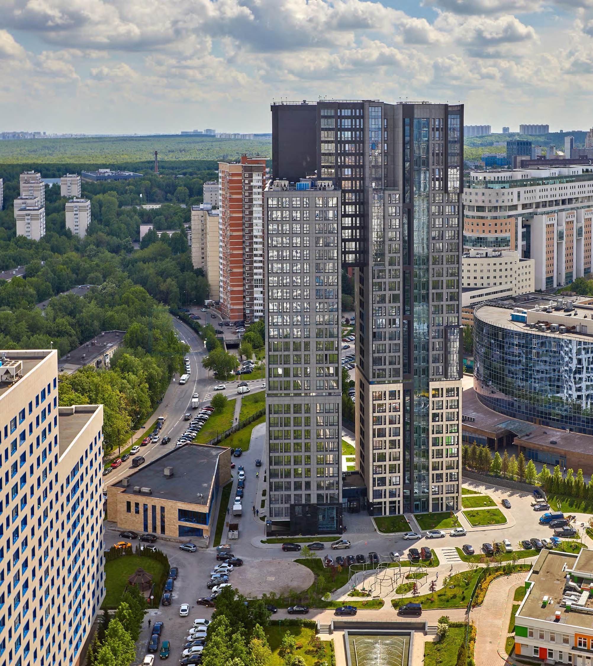 Фасад здания облицован керамогранитом, гранитом и панелями из стемалита. Входные группы украшены натуральным ониксом и элементами фитодизайна.