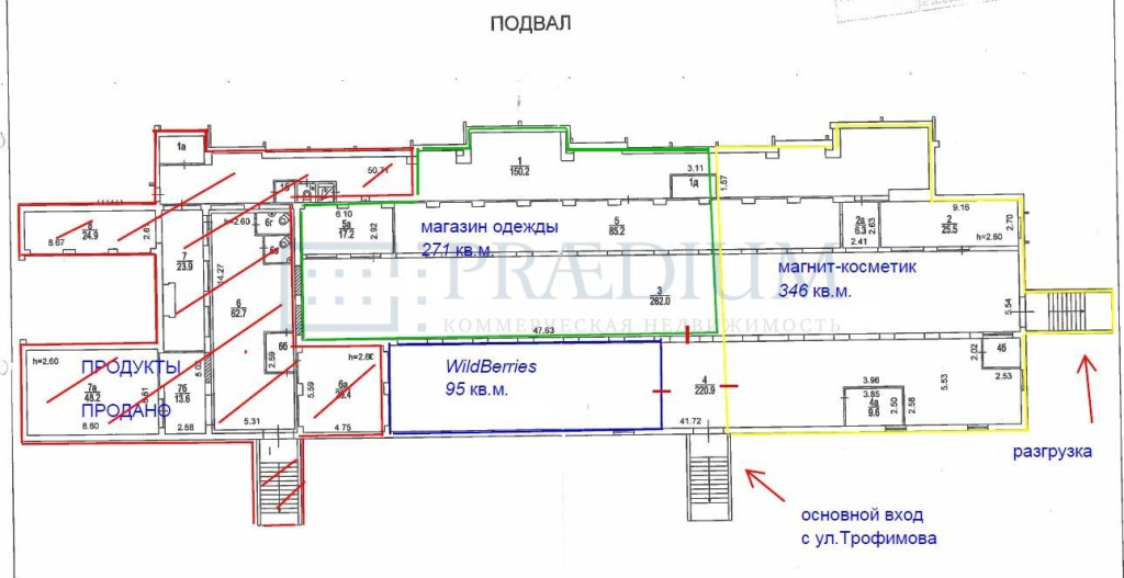 Описание: Цокольное помещение (высота потолков 2.7 м.) самого оживлённого торгового коридора района. Высокий пешеходный и авто трафик, парковка перед магазином, первая линия, реклама на фасаде, все коммуникации.