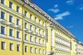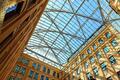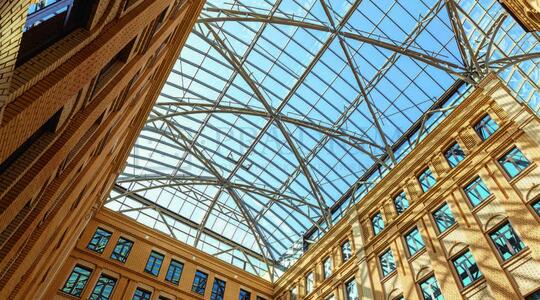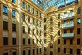Внутри здания расположен благоустроенный внутренний двор(атриум) , крытый стеклянным куполом.