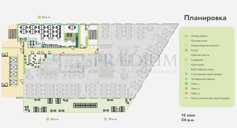 *13 этаж -зона лобби: общая площадь - 2 770 кв.м., арендопригодная площадь - 1 675 кв.м.