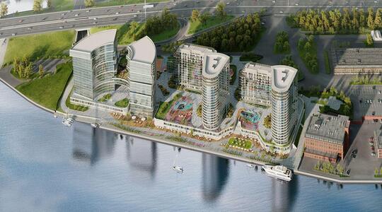 Территория комплекса выходит на собственную благоустроенную набережную с пляжем и яхт-клубом. В двухуровневом стилобате кроме объектов инфраструктуры разместят паркинг. Доступ автомобилей во внутренний двор и на набережную будет закрыт.