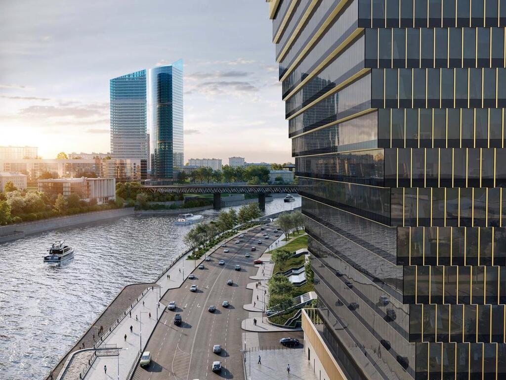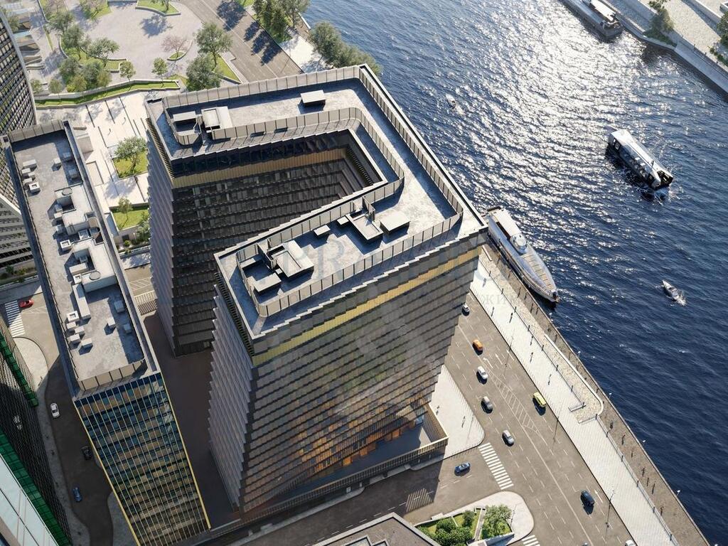 Описание: Проект представляет собой два отдельно стоящих здания площадью 115,800 кв.м., на общем стилобате с подземным паркингом. Перед зданием расположен парк, который находится на эстакаде и соединяет комплекс с набережной Москвы-реки.